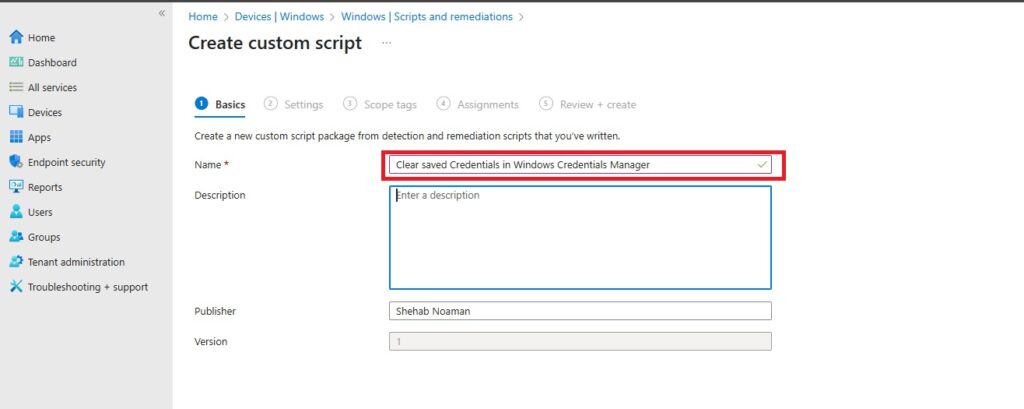 • Enter a name and description that clearly defines the script’s purpose. (Clear saved Credentials in Windows Credentials Manager)